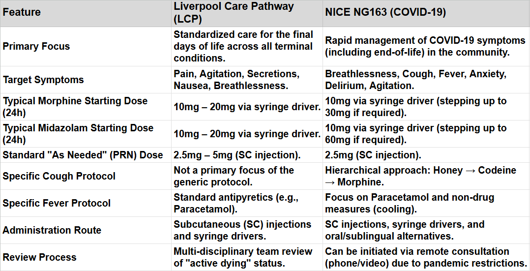 Context of Application: The LCP was (supposedly) a comprehensive “pathway” covering nutrition, hydration, and spiritual care; NG163 is primarily a “symptom management” guideline focused on pharmacological interventions.
