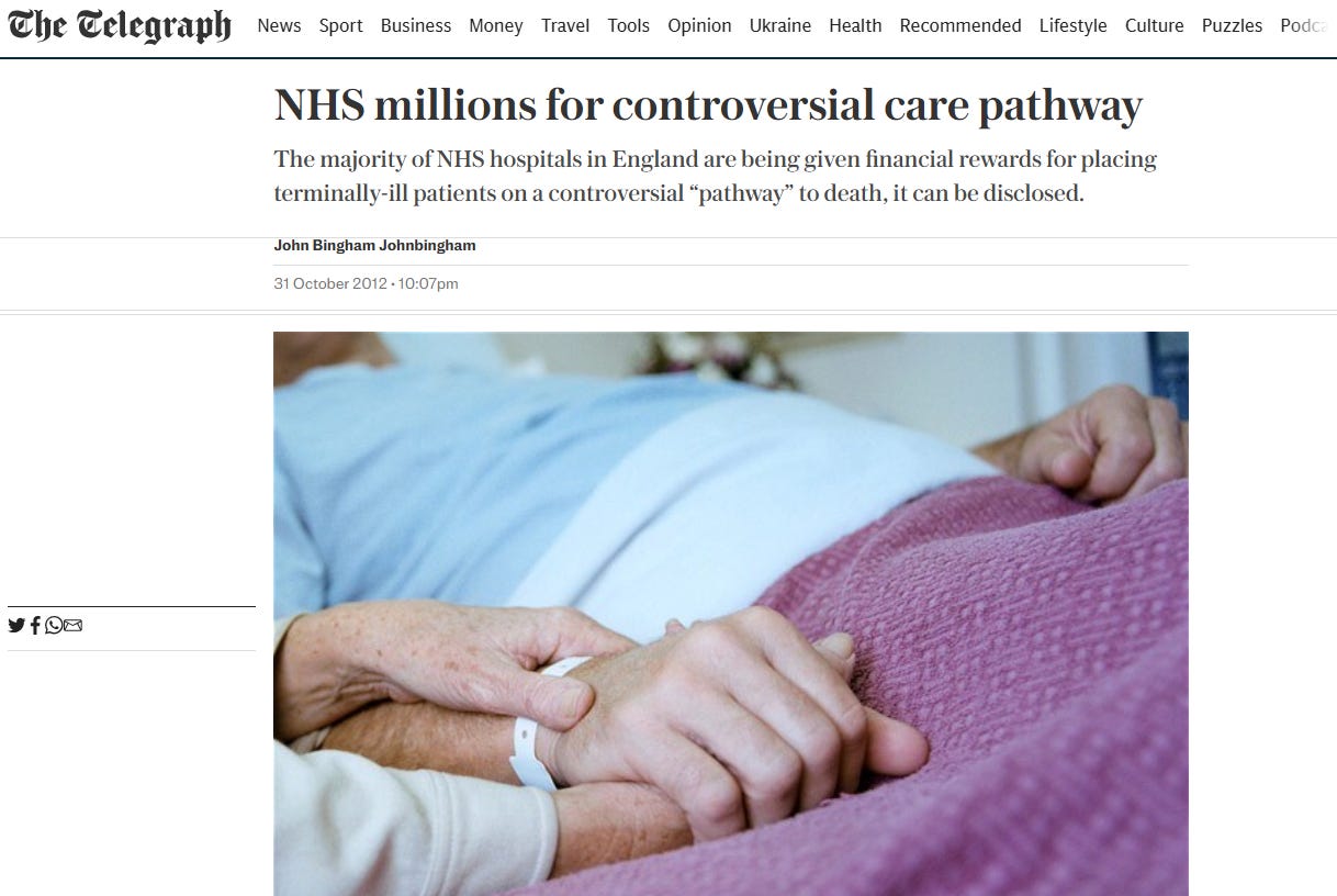 In 2012 a huge story broke in the mainstream press in the UK - the “Liverpool Care Pathway” scandal - click the picture below to go to an archived version of the below Telegraph article on it.