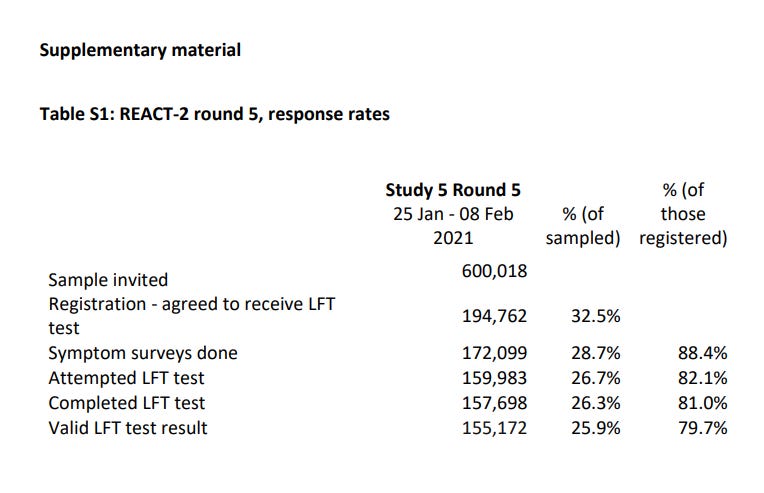 The 600,018 invited were selected at random from an NHS database. That seems reasonable. But the ~200k respondents who agreed to receive an LFT test were entirely self-selected, which biases the sample strongly towards those who “believe in covid” and want to know if they “had it”. Given when this took place, in early 2021, it’s unlikely that many of the respondents would have been sceptical of the government narrative.