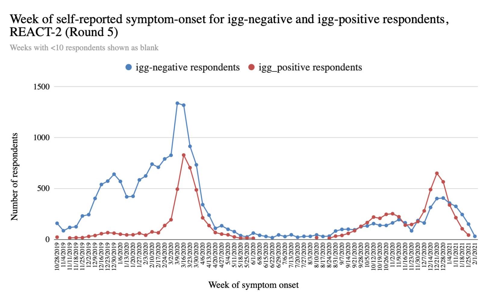 To construct the epidemic curve we used the responses from pages 4–6 of the REACT-2 round 5 user survey (https://www.imperial.ac.uk/media/imperial-college/institute-of-global-health-innovation/210114-Study-5-ANTIBODY-Round-5-User-Survey.pdf) – specifically the COVIDSTA variable to get reported dates of suspected infection. These were filtered to IgG antibody-positive respondents only using the results of the LFT, as reported by the respondent.